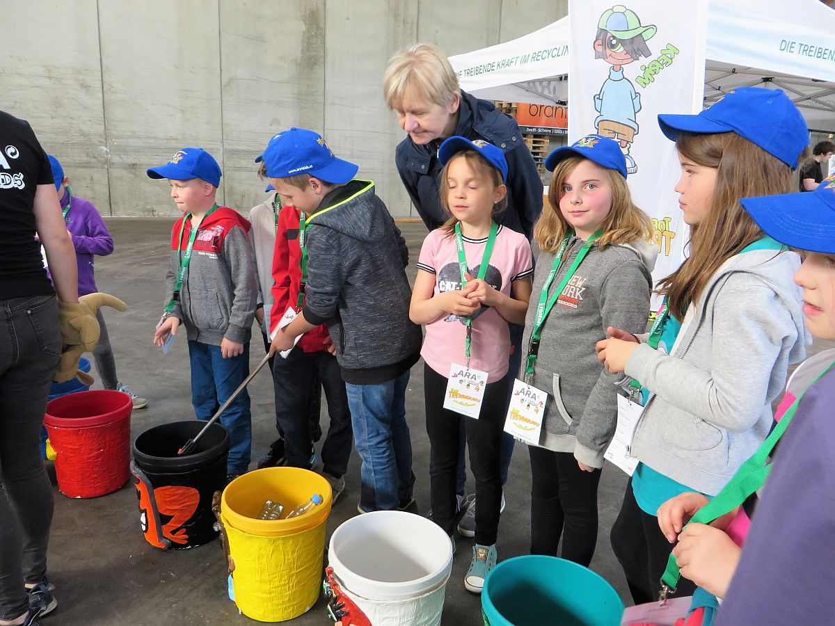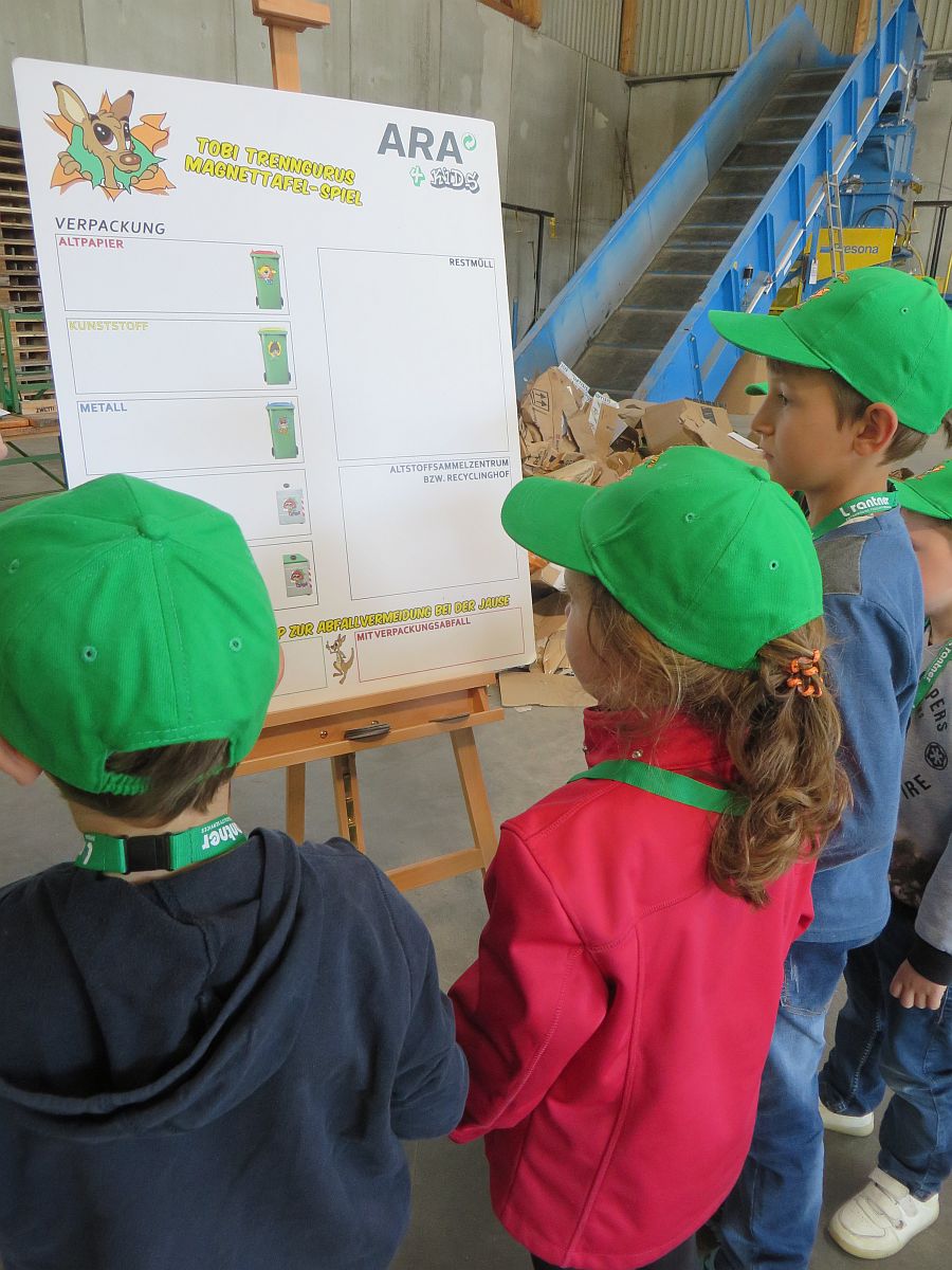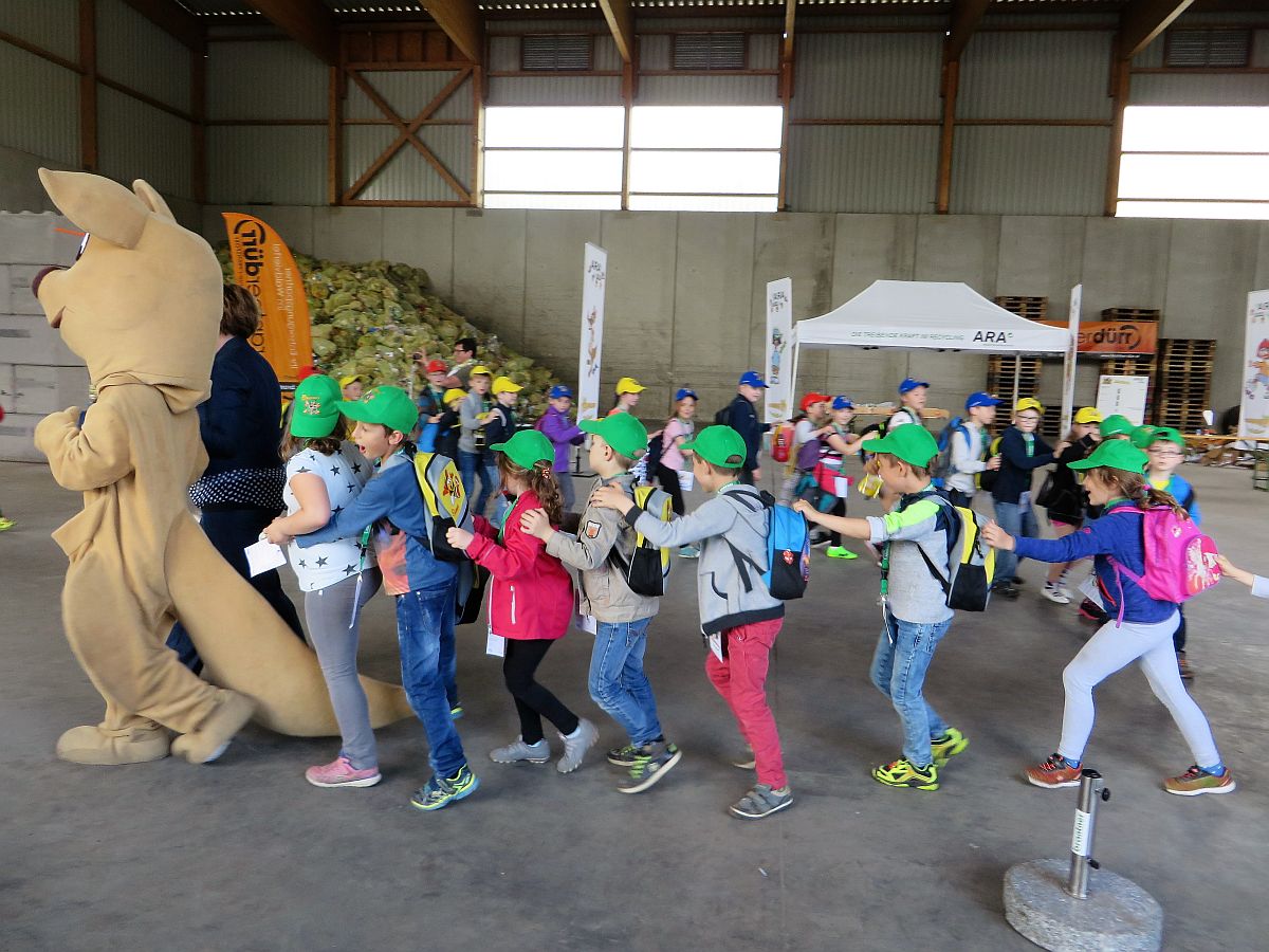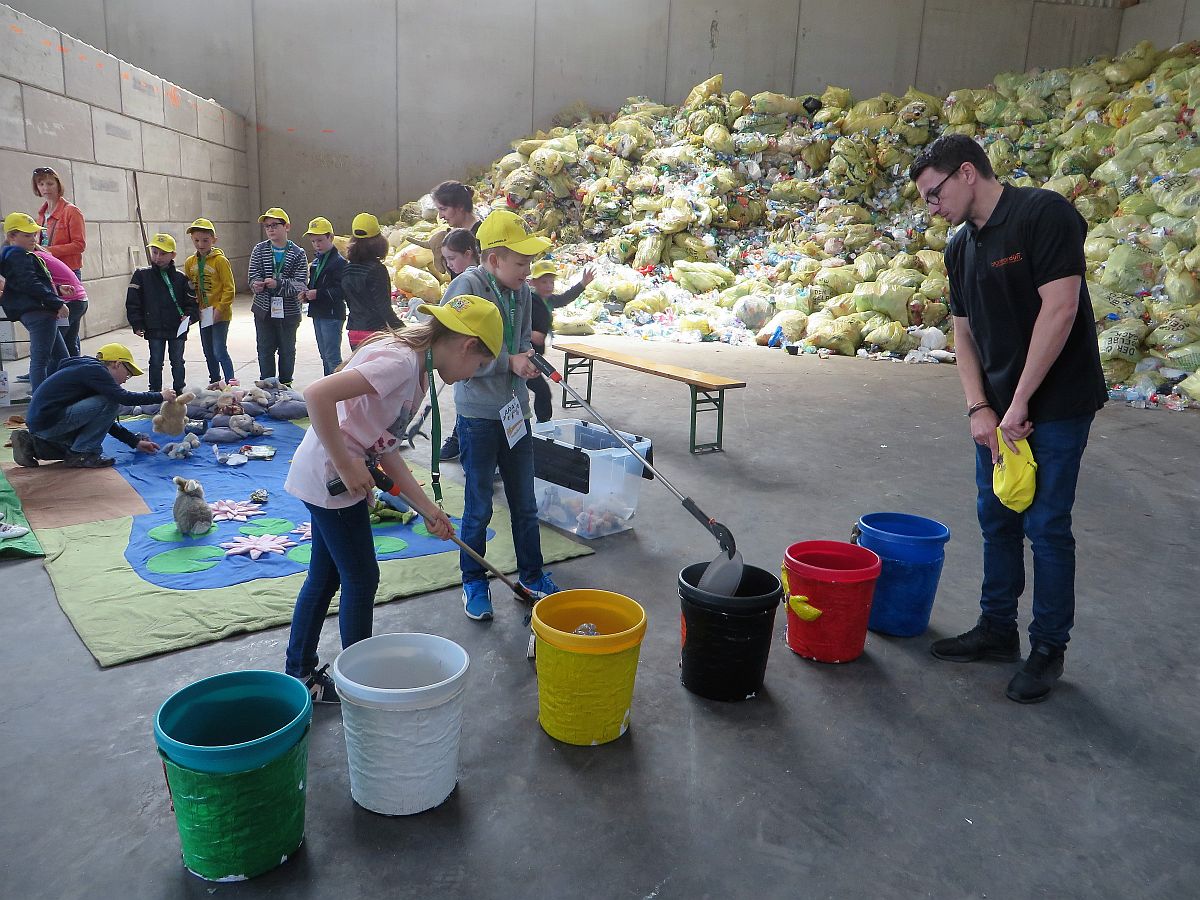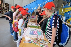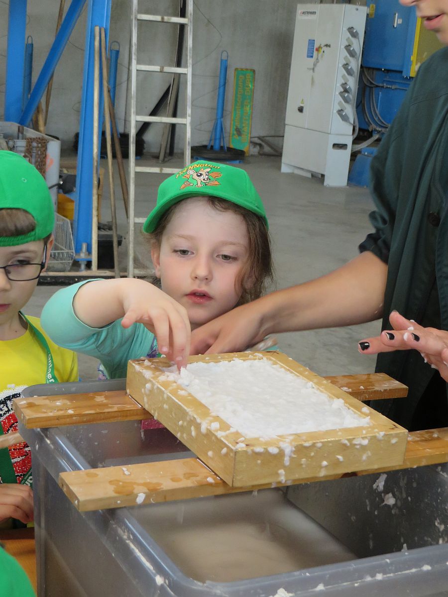 Dort erwartete uns schon Tobi Trennguru, das schlaue Känguru, das weiß, wie man Abfall richtig trennt. An zahlreichen Stationen konnten die Kinder ihr Wissen über die Mülltrennung unter Beweis stellen. Auch beim Papierschöpfen durften sie mithelfen und das Blatt mit Blüten verzieren.