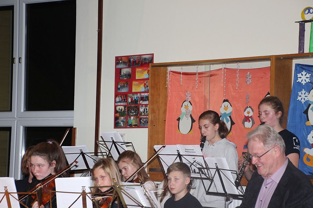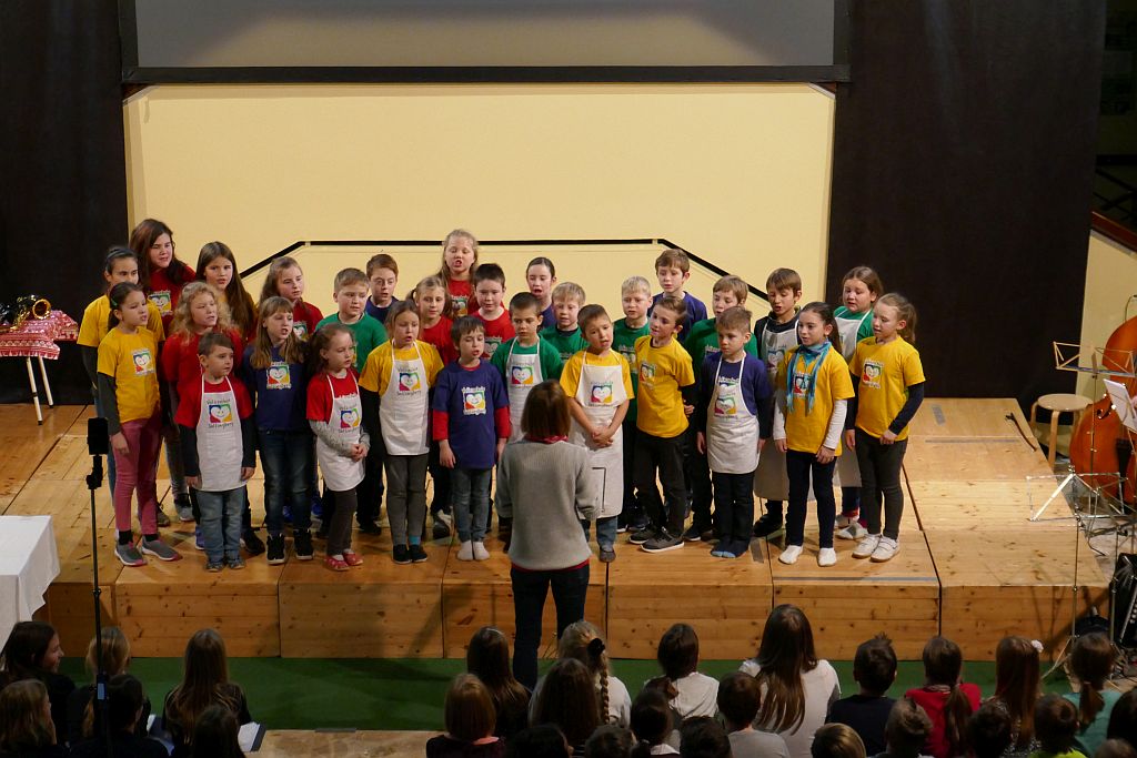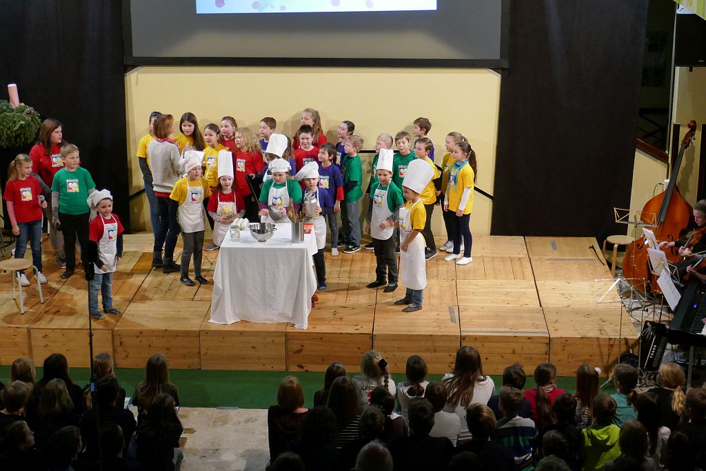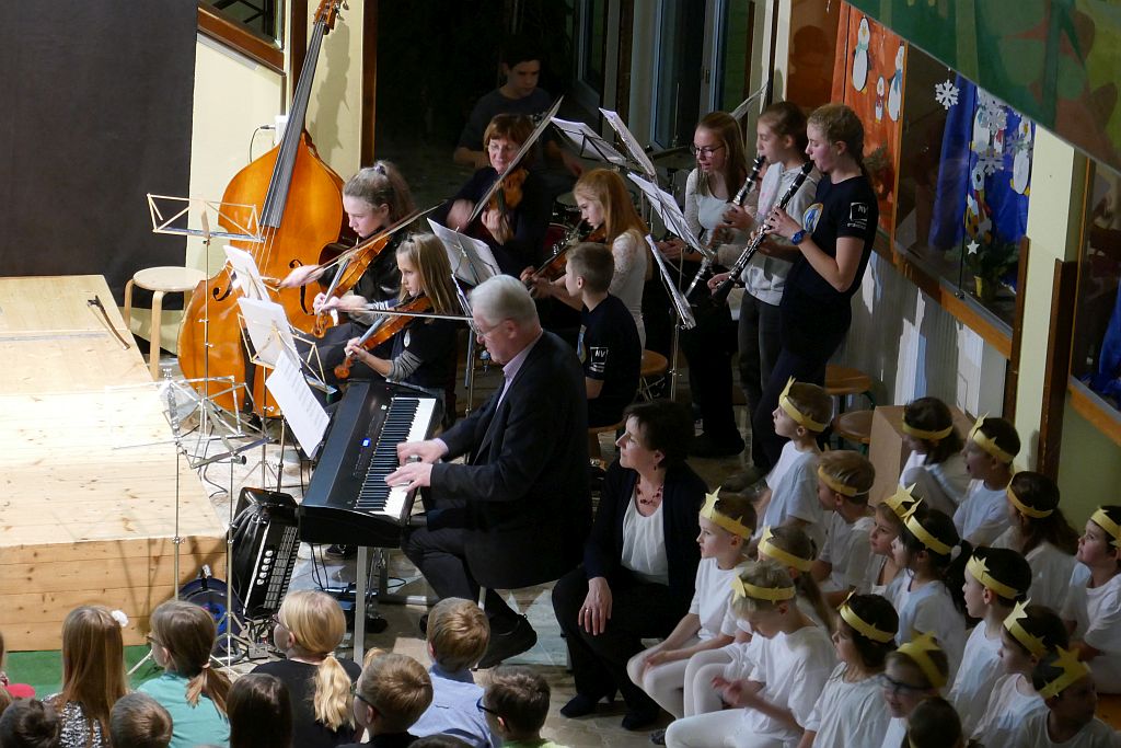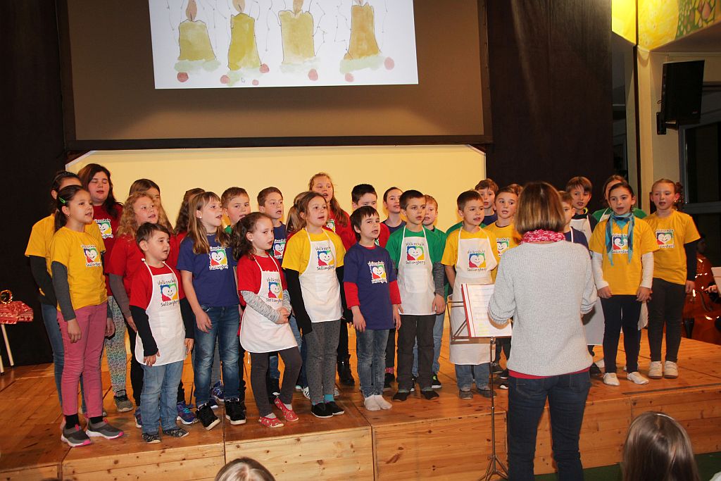 Der Schulchor bot mit dem Musikschulensemble unter der Leitung von Sonja Hackl und OSR Reinhard Hörth drei Lieder dar. Das Lied „In der Weihnachtsbäckerei“ wurde von Kindern der 2. Klasse auch szenisch dargestellt und zum Lied „Es hat sich halt eröffnet“ tanzten die Engelchen aus der 1. Klasse.