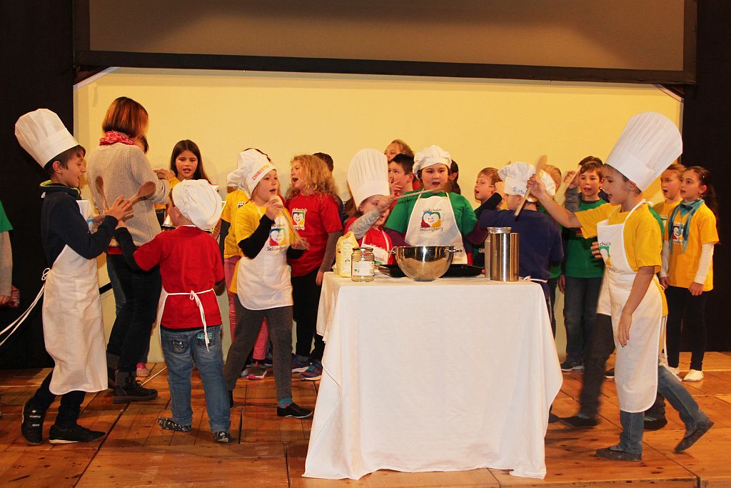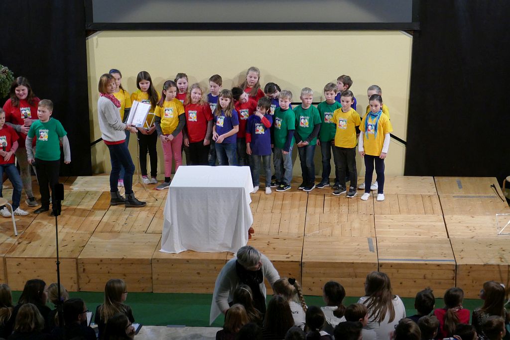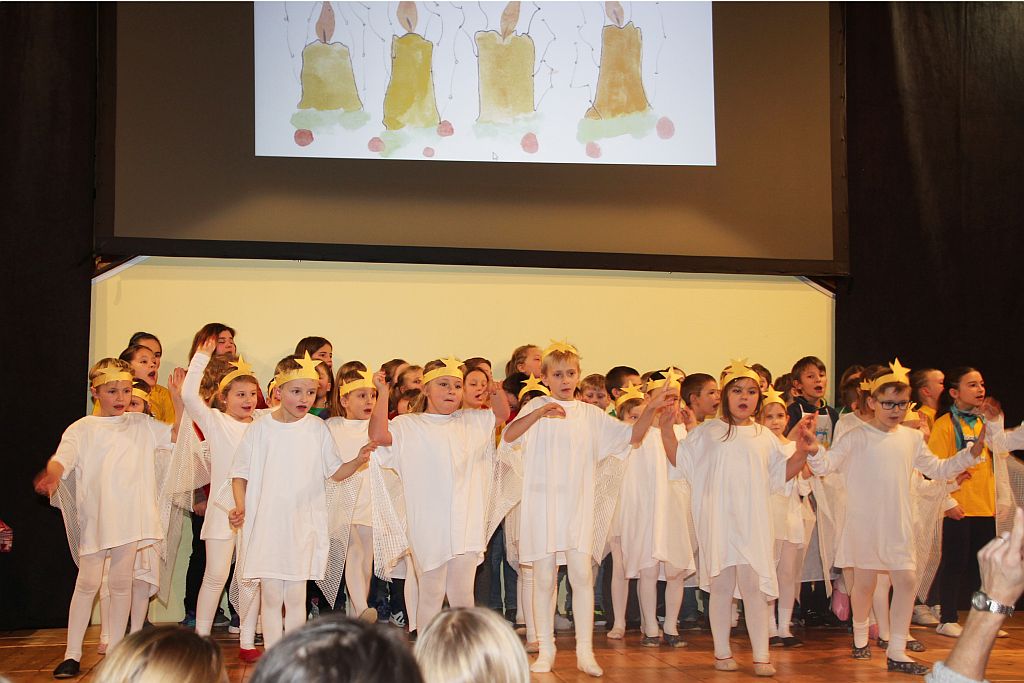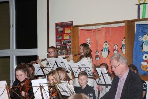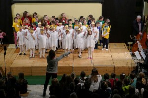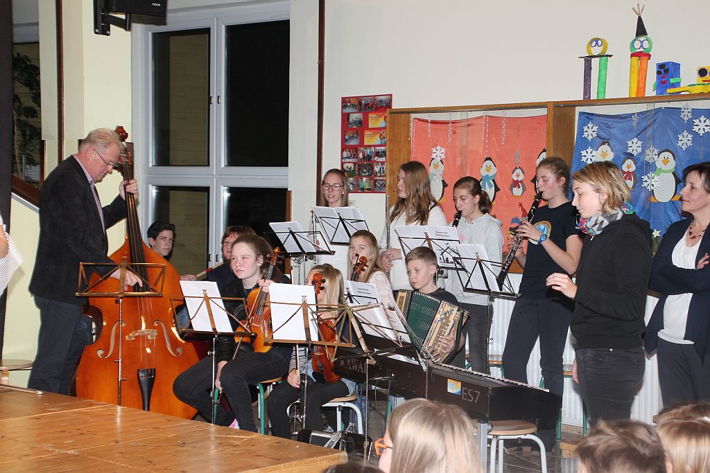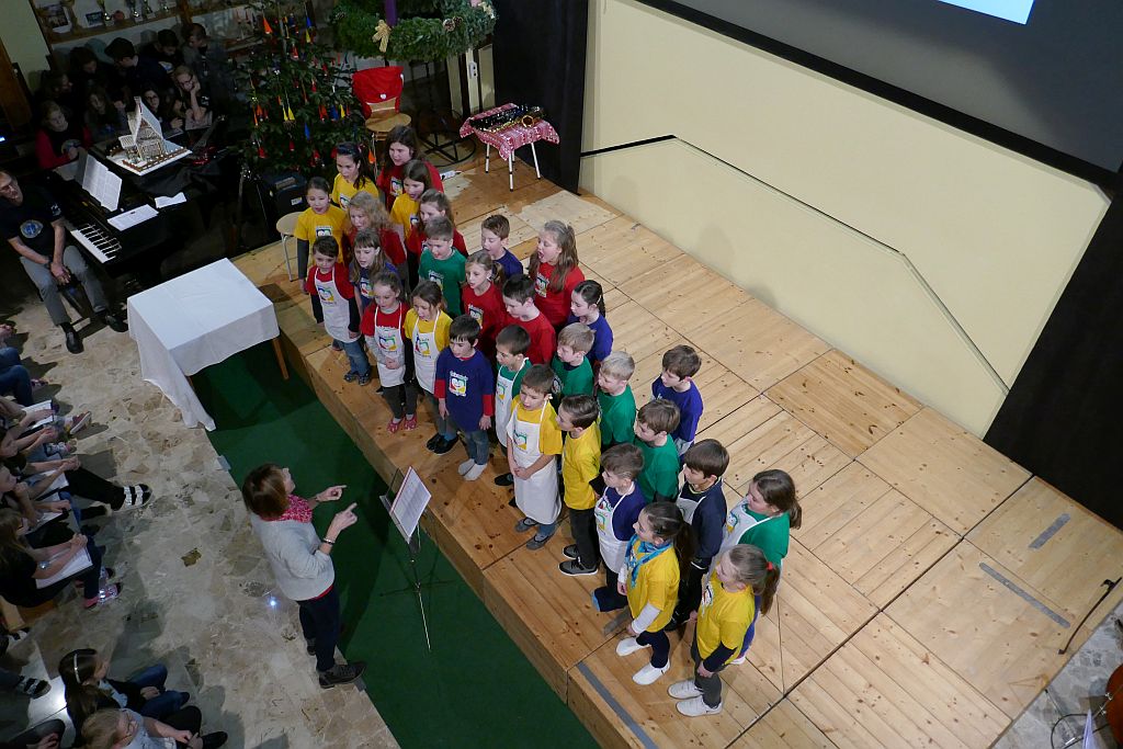 Der Schulchor bot mit dem Musikschulensemble unter der Leitung von Sonja Hackl und OSR Reinhard Hörth drei Lieder dar. Das Lied „In der Weihnachtsbäckerei“ wurde von Kindern der 2. Klasse auch szenisch dargestellt und zum Lied „Es hat sich halt eröffnet“ tanzten die Engelchen aus der 1. Klasse.