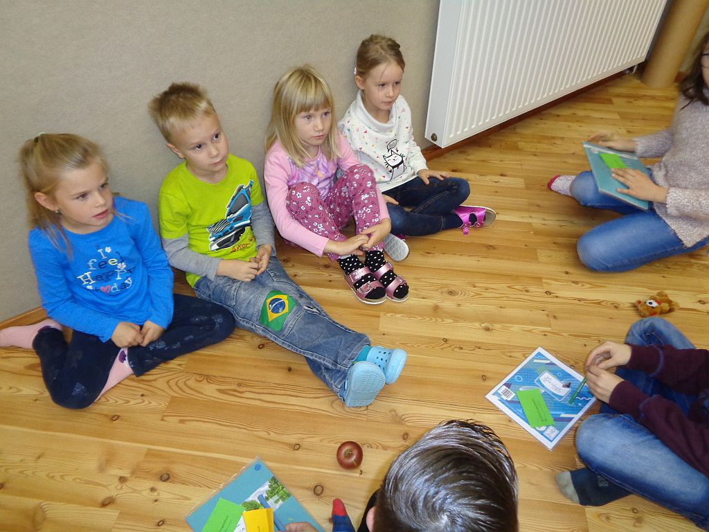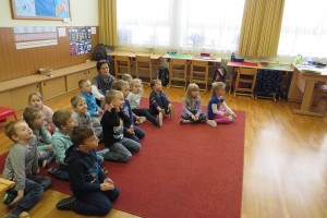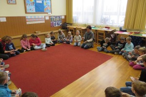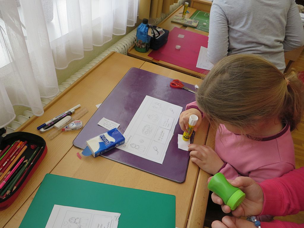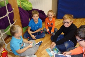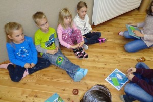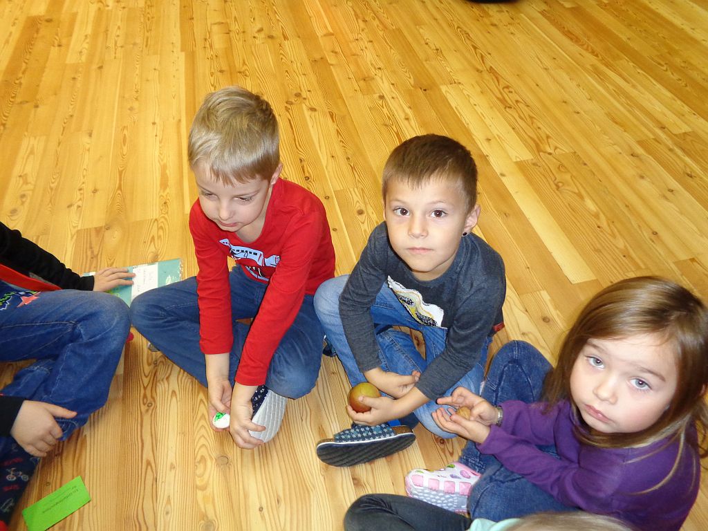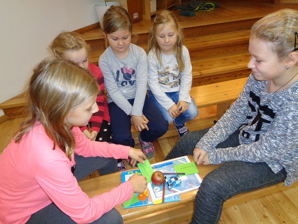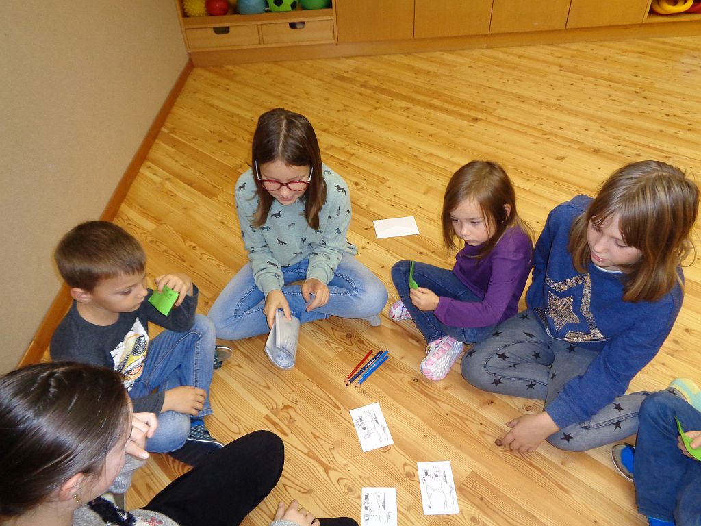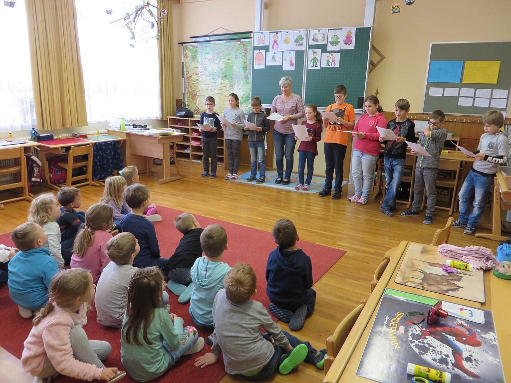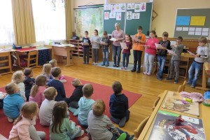 Die Kinder der 4. Klasse besuchten die Kinder im Kindergarten und lasen dort gruppenweise ihre selbstverfassten Bildgeschichten vor. Die Vorschulkinder ordneten dazu die Bilder und falteten ein Bilderbuch. Nach der Geschichte „Das Einfachsogeschenk“ überreichten die großen den kleinen ein „Einfachsogeschenk“, das von Herzen kam.