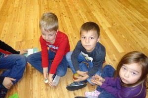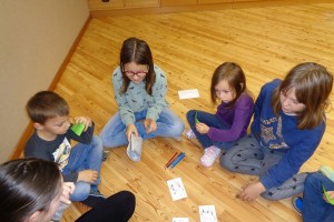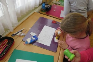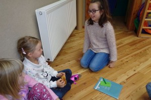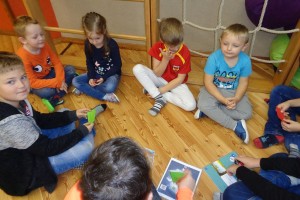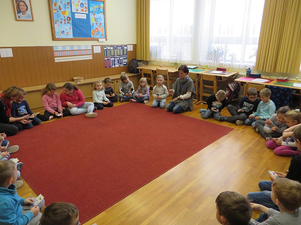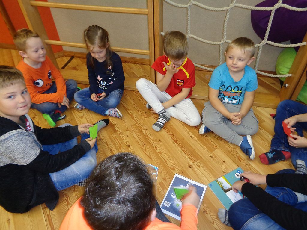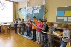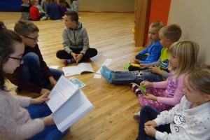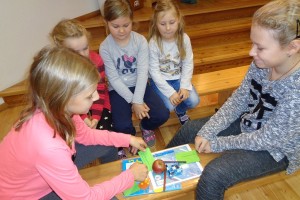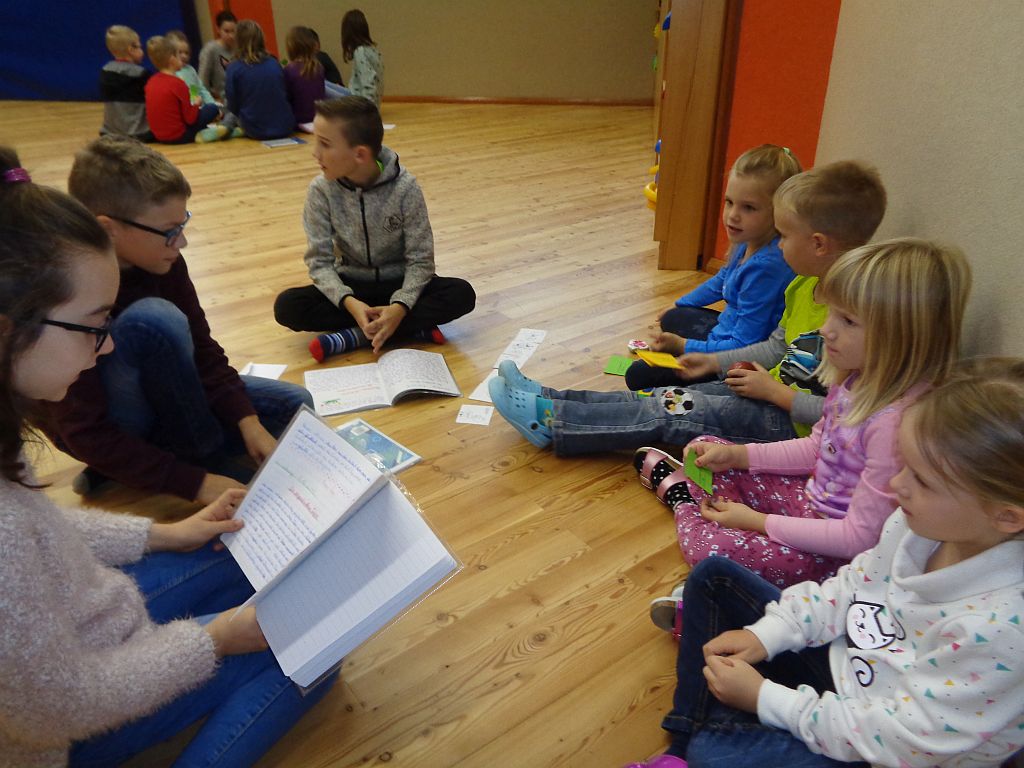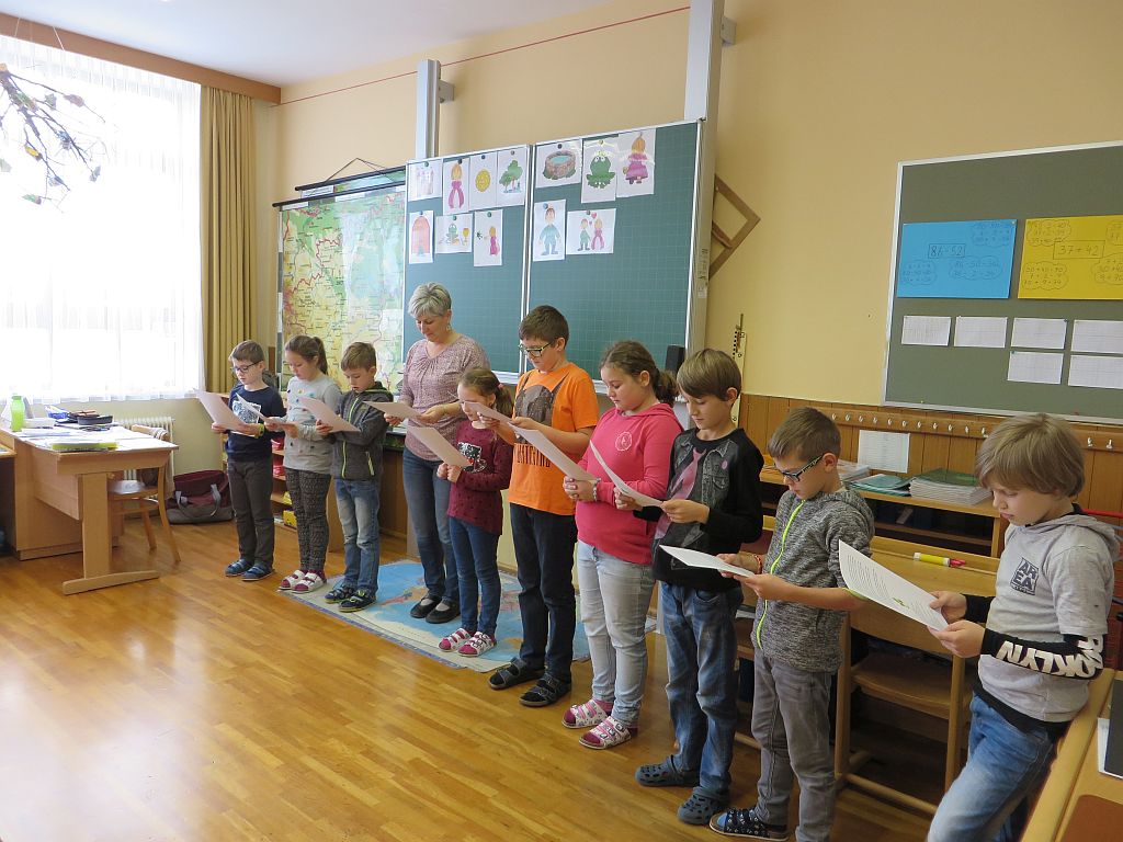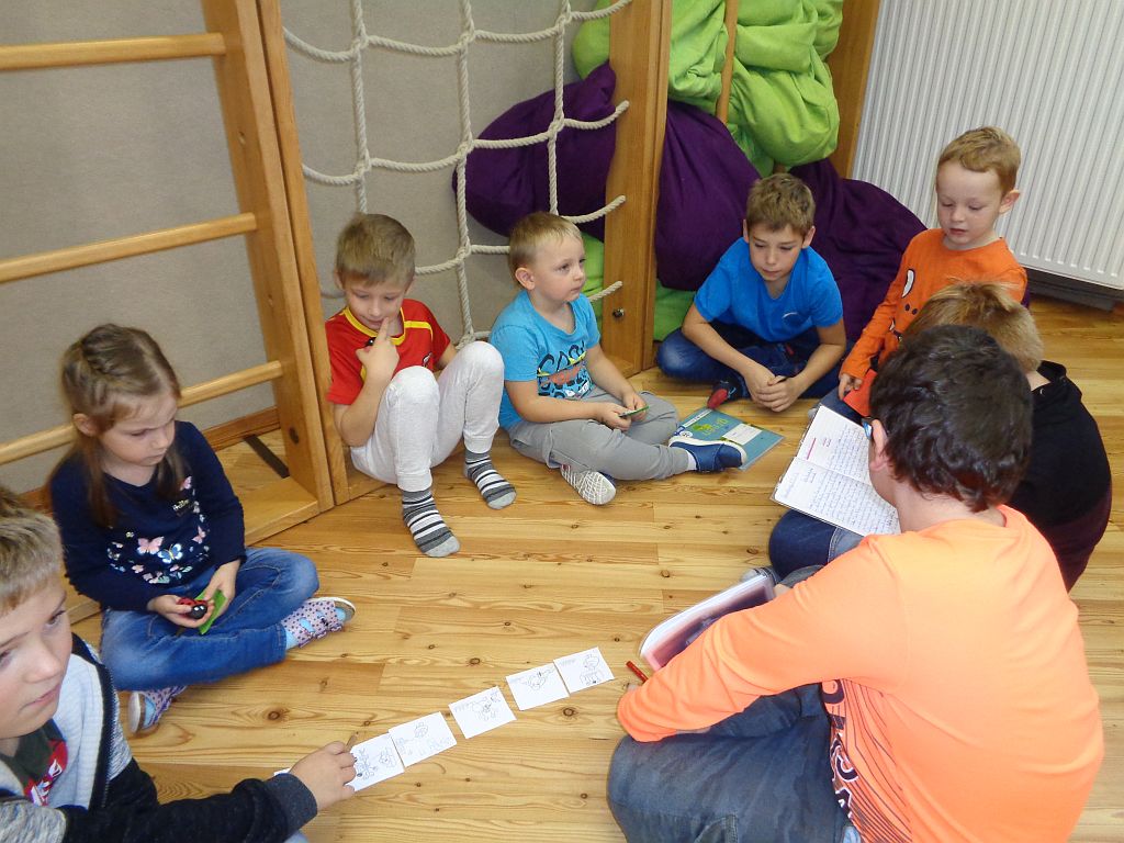 Die Kinder der 4. Klasse besuchten die Kinder im Kindergarten und lasen dort gruppenweise ihre selbstverfassten Bildgeschichten vor. Die Vorschulkinder ordneten dazu die Bilder und falteten ein Bilderbuch. Nach der Geschichte „Das Einfachsogeschenk“ überreichten die großen den kleinen ein „Einfachsogeschenk“, das von Herzen kam.