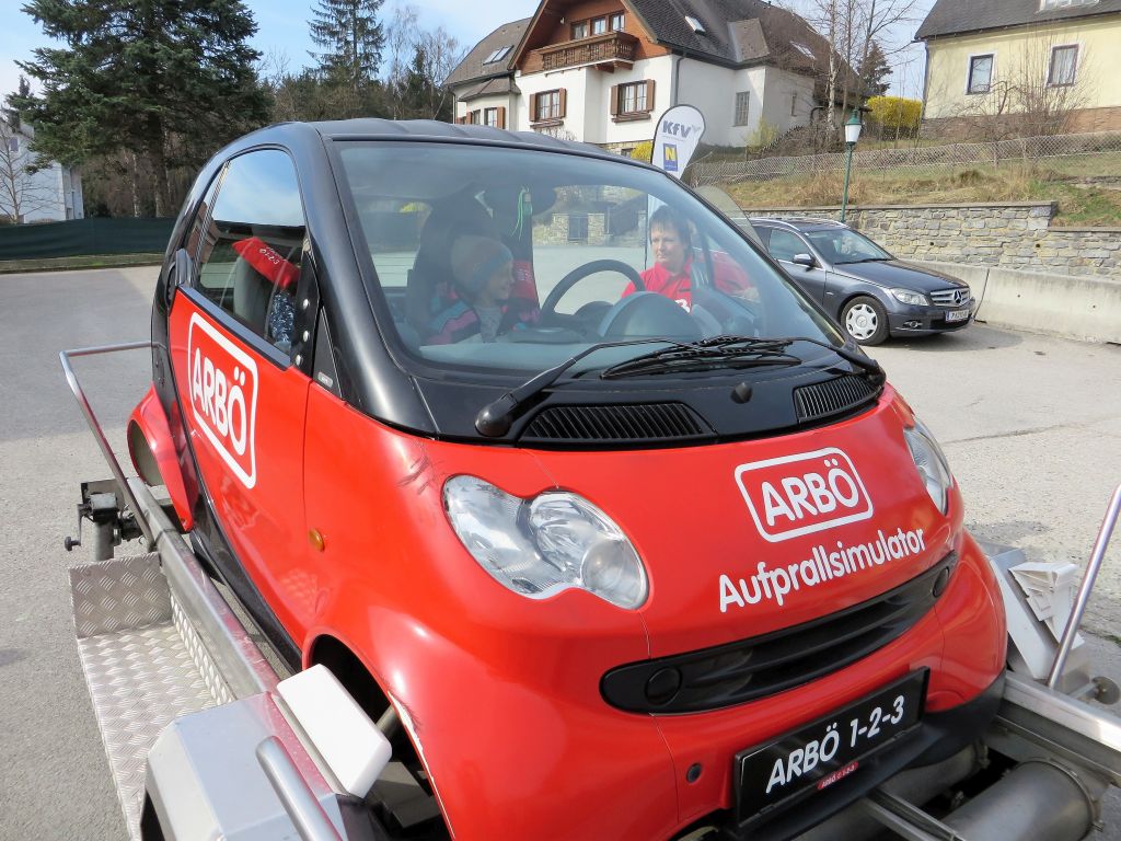 Mit dem Aufprallsimulator ist es möglich, einen Frontalzusammenstoß realitätsnahe bei ca. 10 km/h zu vermitteln. Die Simulation war für die angegurteten Kinder harmlos, aber zugleich sehr beeindruckend. Sie spürten, wie wichtig und unverzichtbar das Anlegen des Sicherheitsgurtes und eine richtig eingestellte Kopfstütze ist.