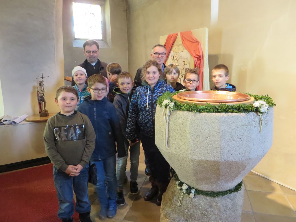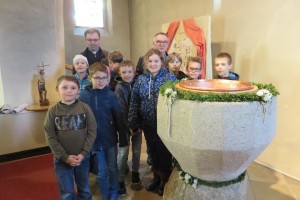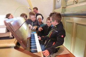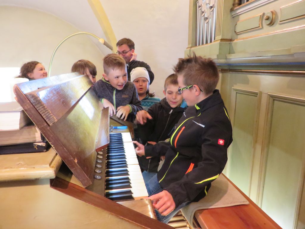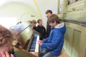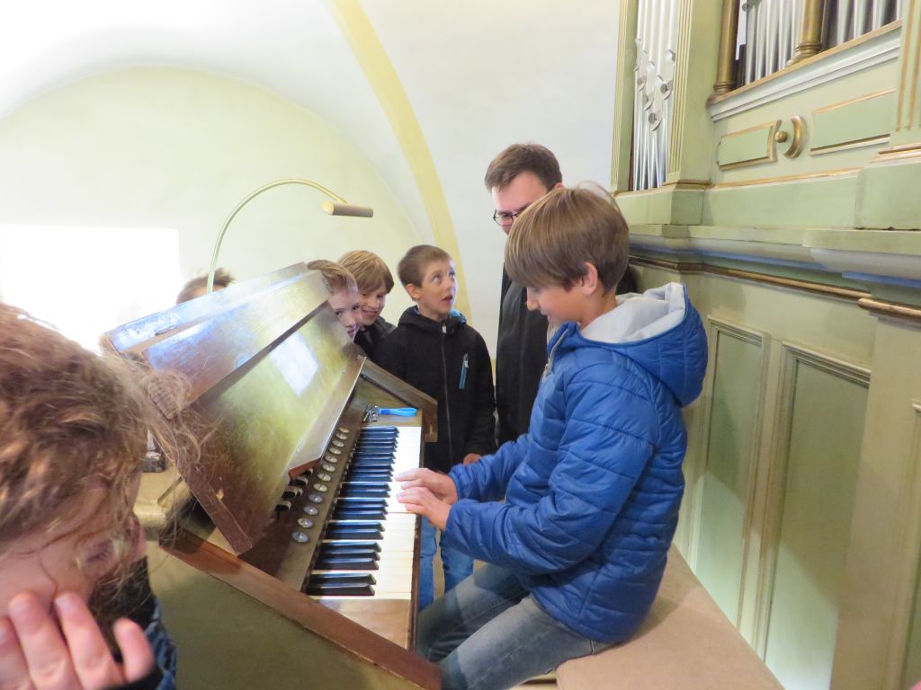 In der Pfarrkirche erwarteten uns schon Diakon Hermann Dornhackl und Pfarrmoderator Mag. Krystian Lubinski. Wir bewunderten das alte Kirchenfenster, den Taufstein und noch Vieles mehr. Herr Pfarrer zeigte uns seine Orgelkünste und jedes Kind durfte ausprobieren, wie schwierig das Orgelspielen eigentlich ist.