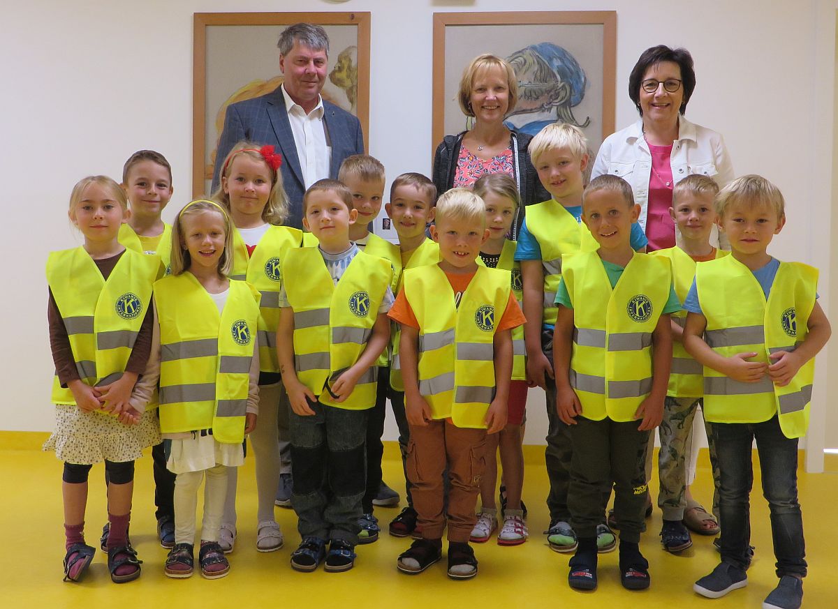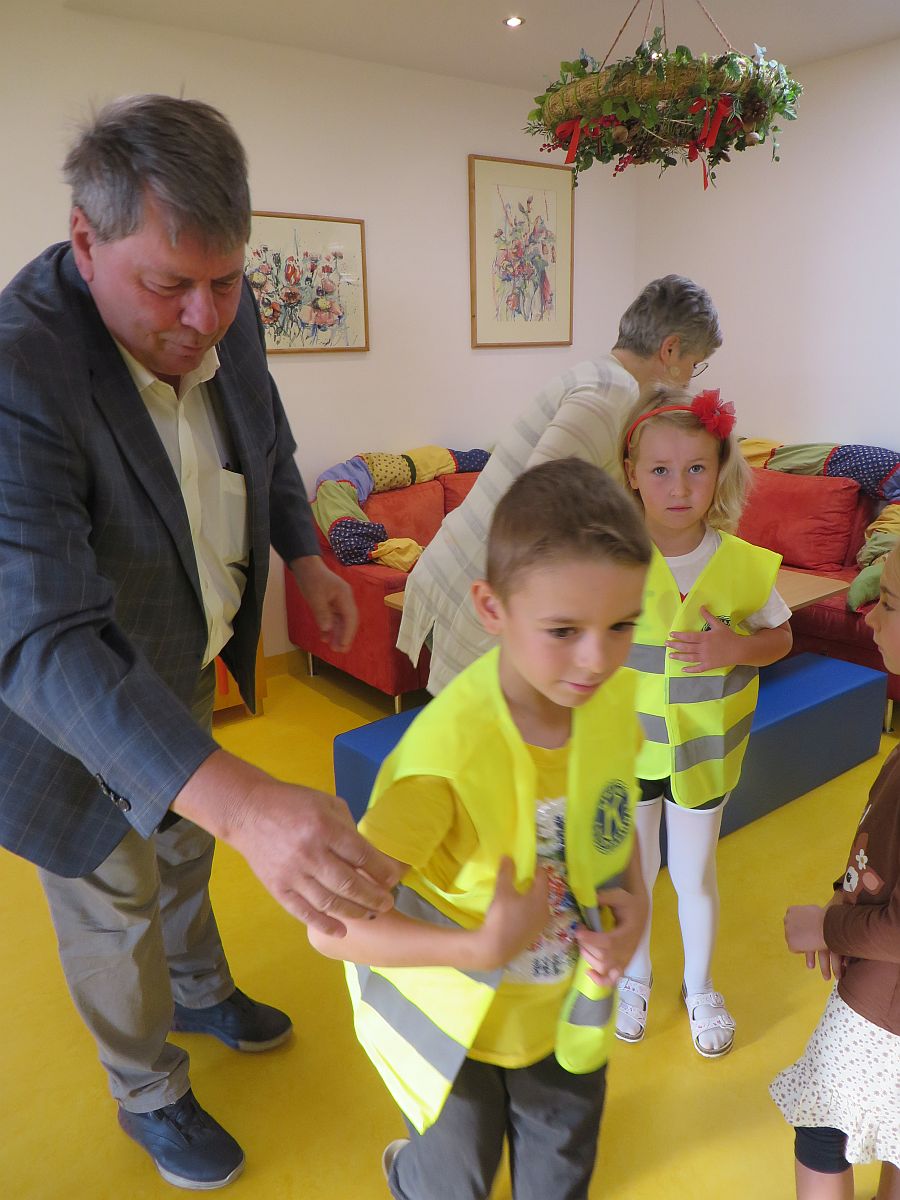 Er überraschte unsere Kleinen mit Warnwesten, die vom Kiwanis Club gespendet werden. Sie wurden natürlich sofort angezogen und stolz am Foto präsentiert.