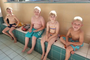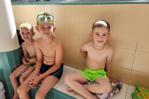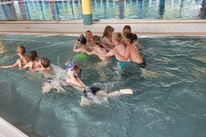 Unter der Leitung von SR Gerhard Schnabl aus der MS Ottenschlag und Sonja Hackl gibt es Wassergewöhnungsübungen, Spiele, Sprungtraining und Schwimmübungen. Auch die Rutsche wird fleißig frequentiert.