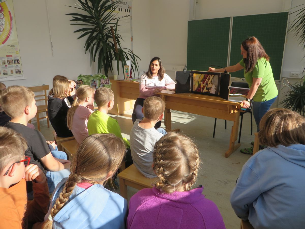 Er erzählte den Kindern Geschichten rund um die Bücherei von Sallingberg. Anschließend lasen die Büchereidamen den Kindern ein Buch vor und zeigten dabei die Bilder am Kamishibai.