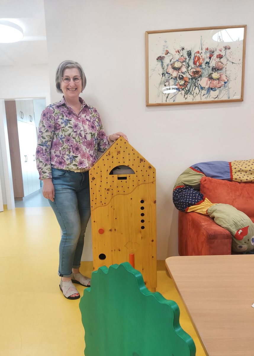 Das gelbe Häuschen, das rote Regal mit Krone und das Bänkchen passen gut in die Aula. Herzlichen Dank an Familie Rametsteiner!