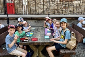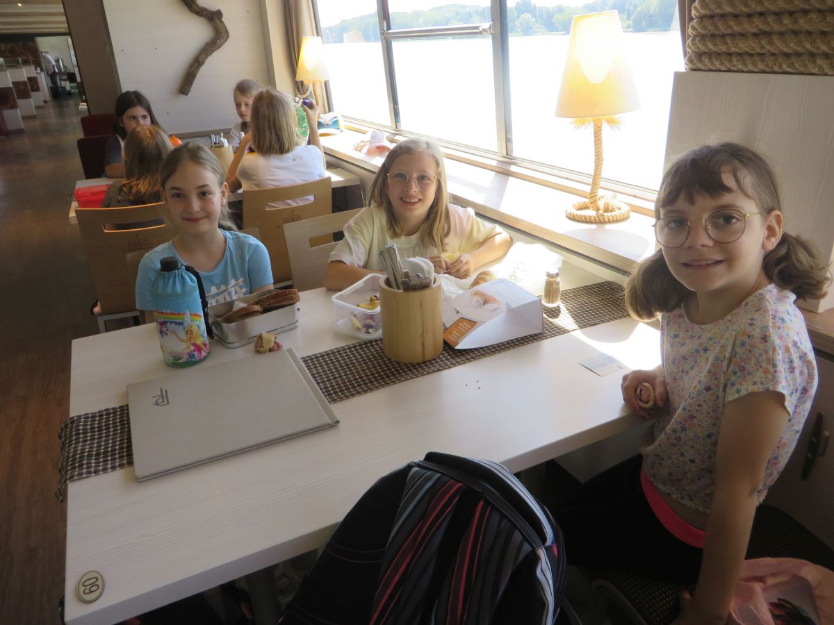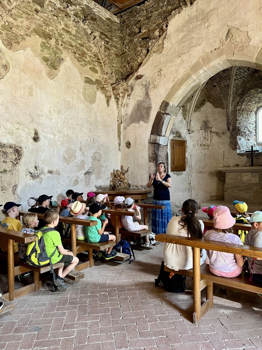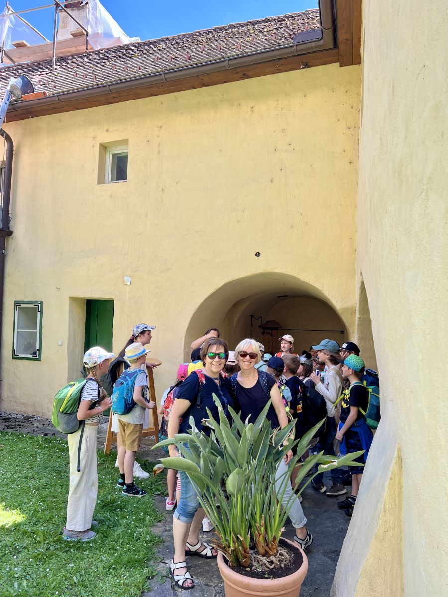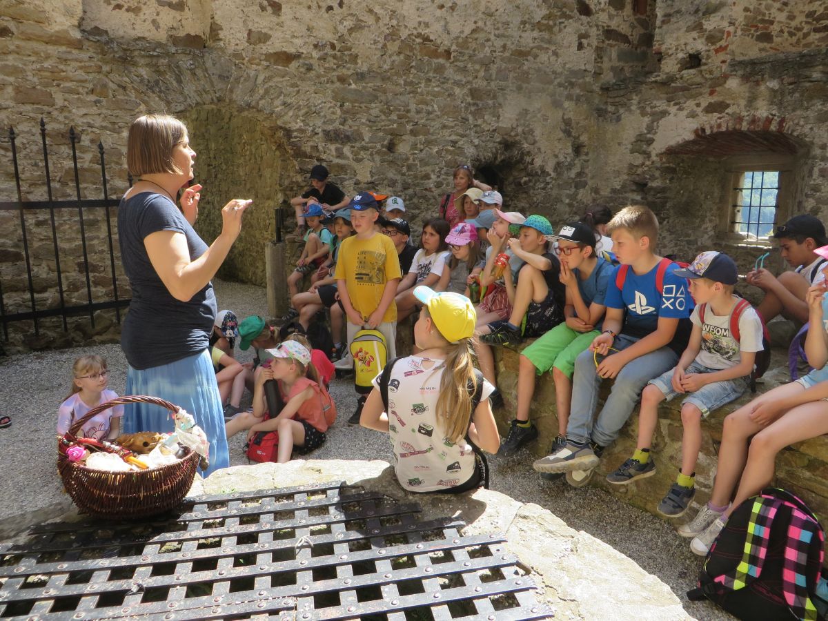 Nach dem abwechslungsreichen Frühstück und dem Einpacken holten uns am Mittwoch der Bus mit den Kindern der 1. und 2. Schulstufe und ihrer Lehrerin Sonja Hackl ab. Wir stiegen zu und fuhren zur Burgruine Aggstein. Dort unterhielt uns Märchenerzählerin Dena Seidl mit ihren wunderbaren Geschichten. Zum Abschluss ging es noch auf Schnitzeljagd und dann nach Hause.