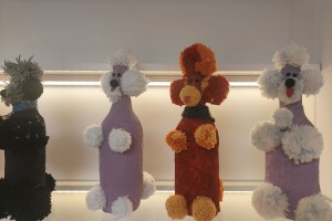 Der Pudel besteht aus einer recycelten Glasflasche, Papiermache, Acrylfarbe und Wollquasten.
