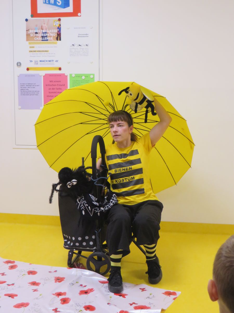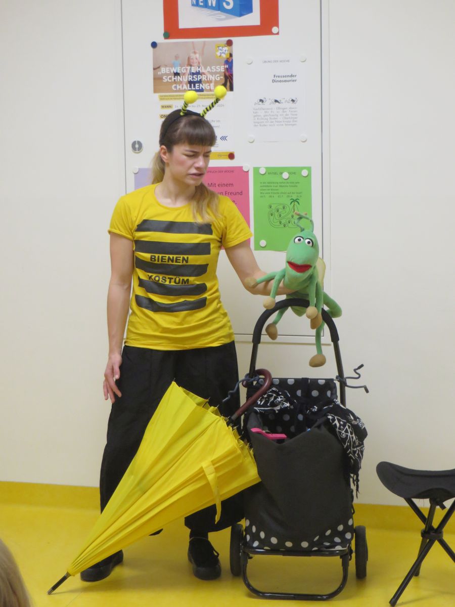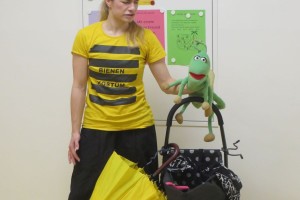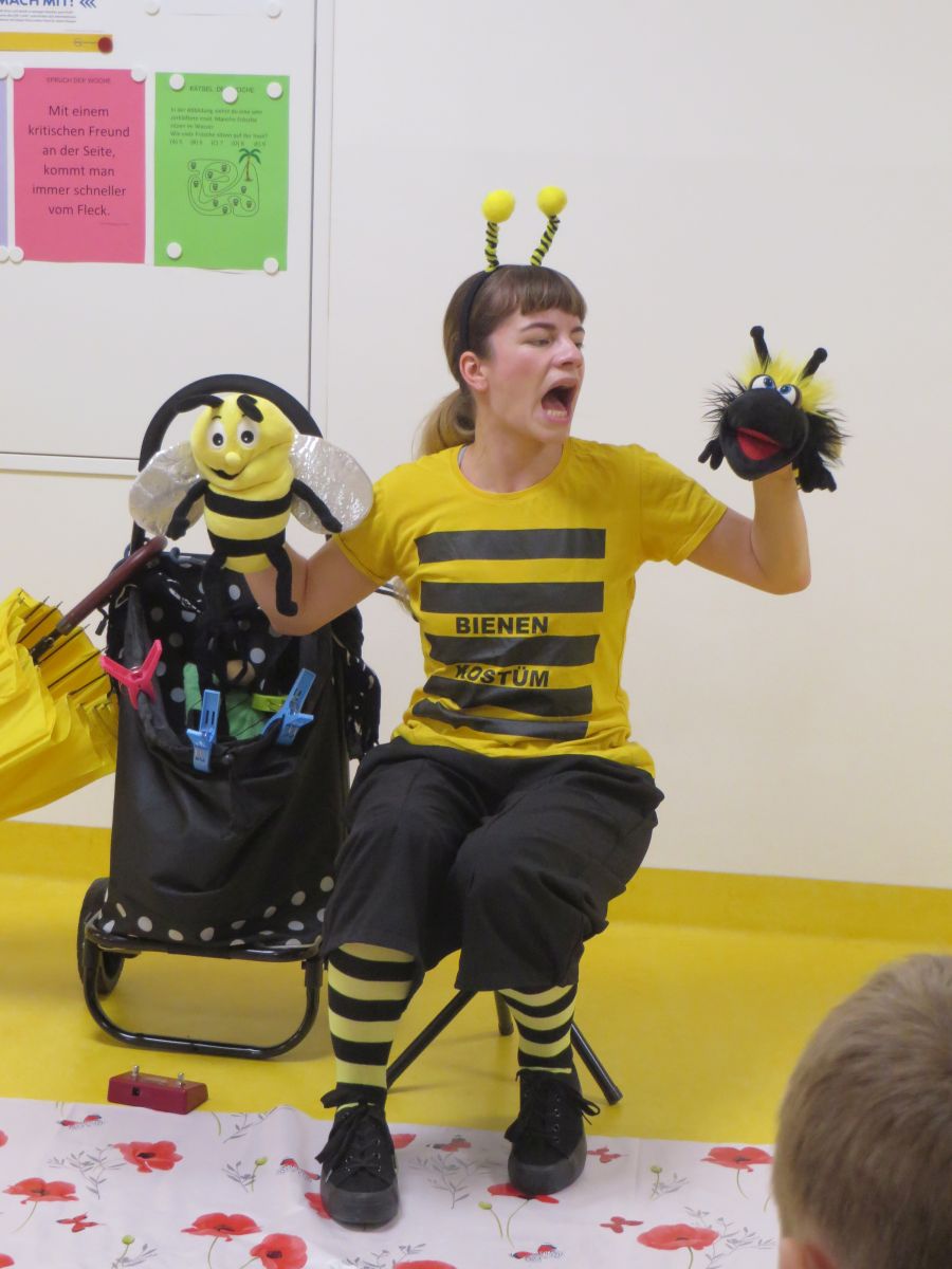 Die Darstellerin Veronika Zeller erzählte die Geschichte von Biene Maja, die mit ihrem Freund Willy zur Klatschmohnwiese fliegt, dabei manches Abenteuer erlebt und neue Freunde kennenlernt. Alle Kinder verfolgten mit großer Spannung und Begeisterung das Theaterstück, da Frau Zeller mit vollem Engagement jede Rolle selbst verkörperte.