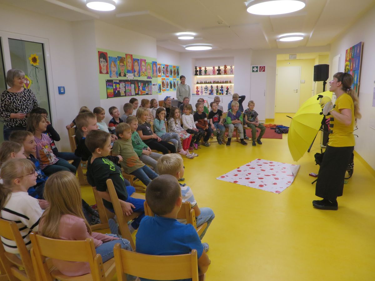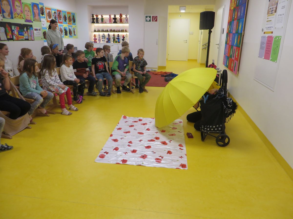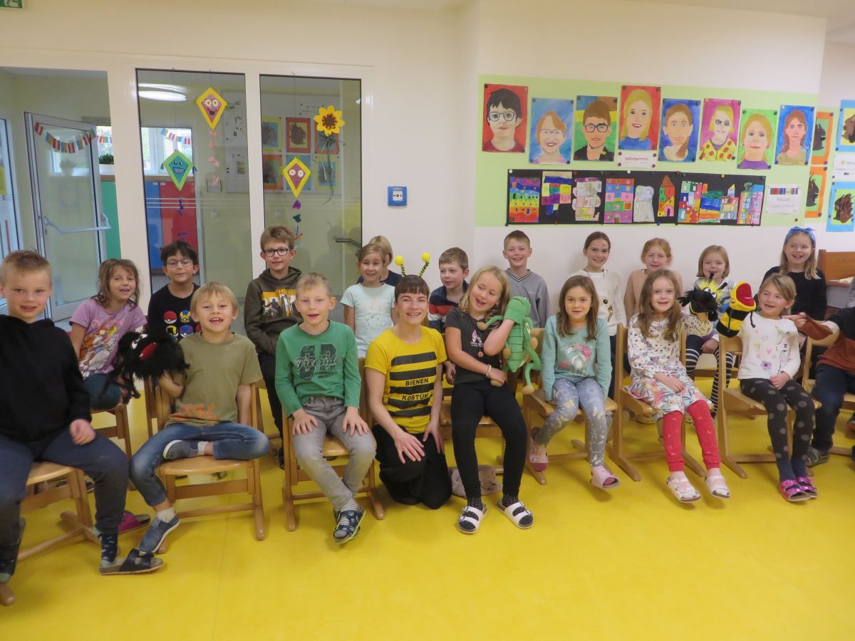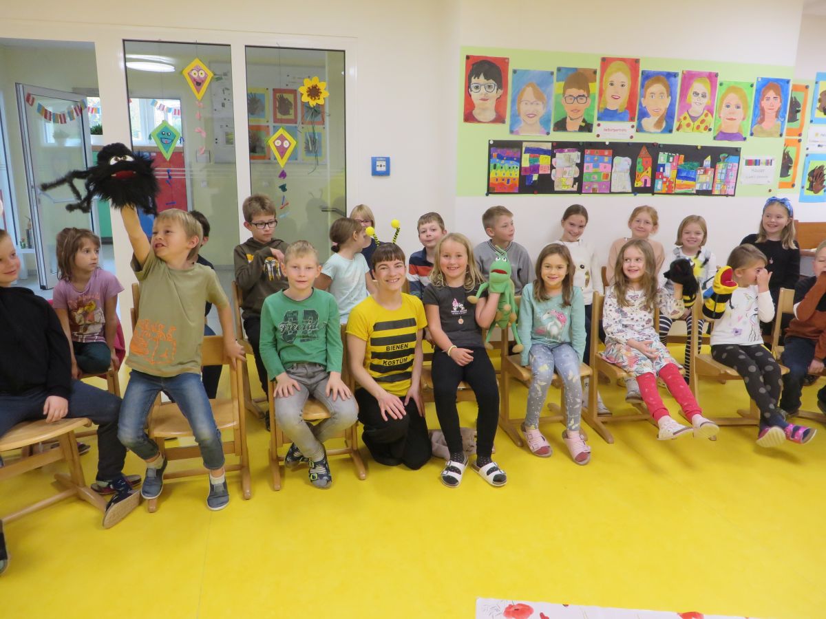 Die Darstellerin Veronika Zeller erzählte die Geschichte von Biene Maja, die mit ihrem Freund Willy zur Klatschmohnwiese fliegt, dabei manches Abenteuer erlebt und neue Freunde kennenlernt. Alle Kinder verfolgten mit großer Spannung und Begeisterung das Theaterstück, da Frau Zeller mit vollem Engagement jede Rolle selbst verkörperte.