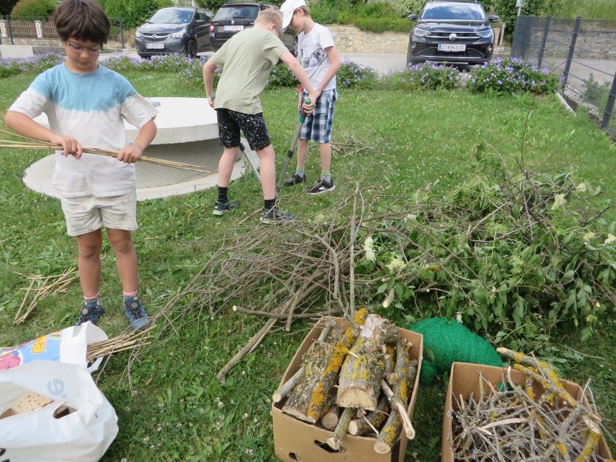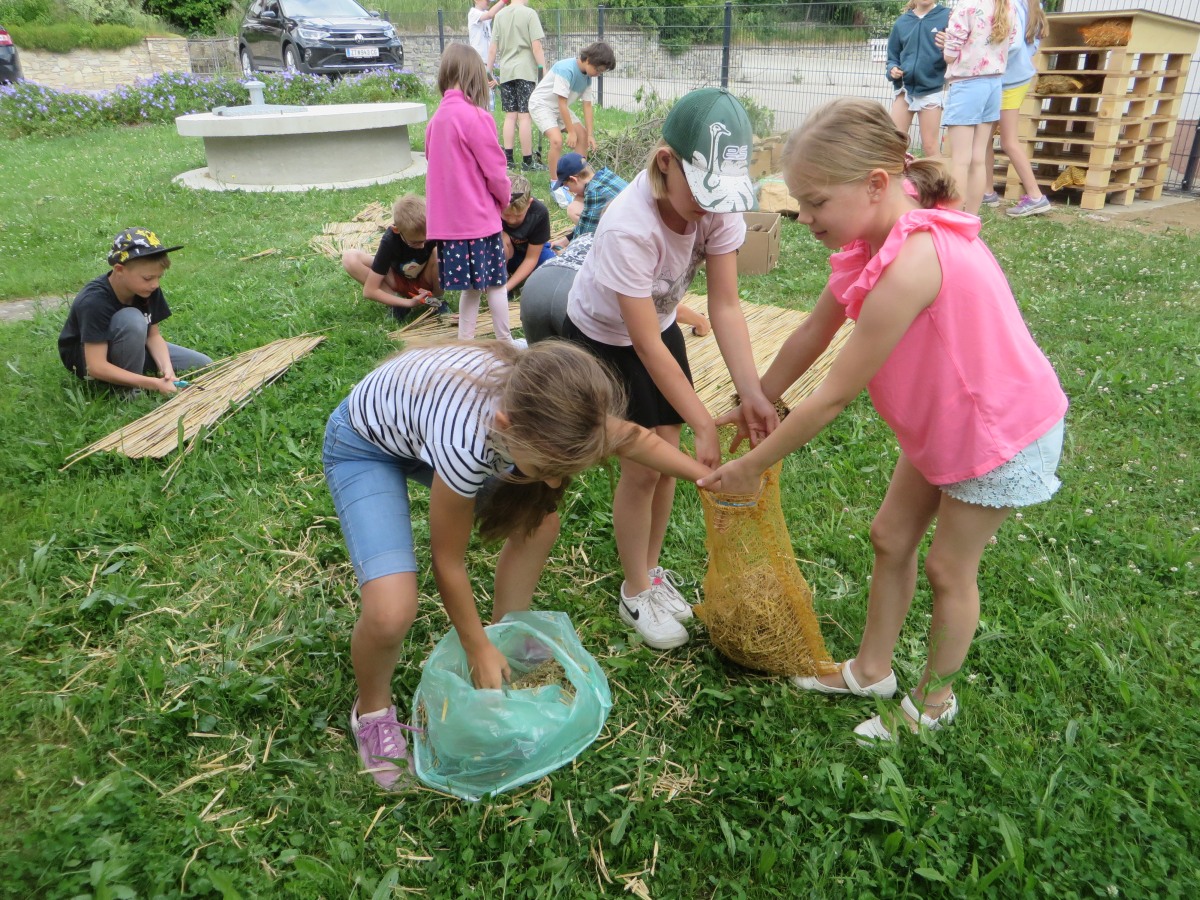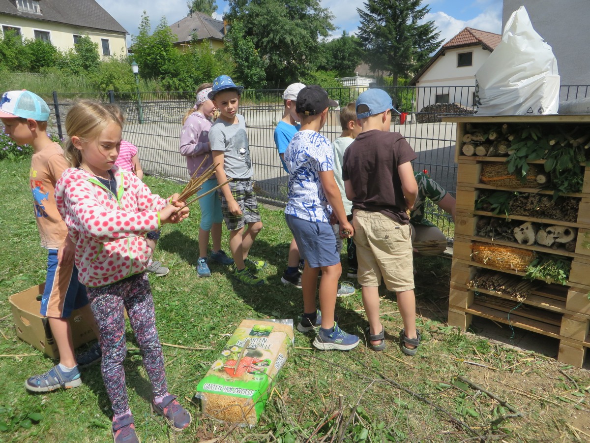 Die Eltern der 4. Schulstufe schenkten der Volksschule zum Schulschluss ein Insektenhotel, welches von den Kindern befüllt wurde.
