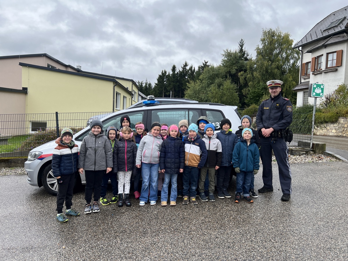 Am Montag, 6. Oktober 2025, besuchte Herr Leonhard Scheikl von der Polizeiinspektion Waldhausen die 1. und 2. Schulstufe. Nach einer Einführung in der Klasse übten die Schulkinder das richtige Überqueren der Straße und das richtige Verhalten im Straßenverkehr bei einem Lehrausgang.