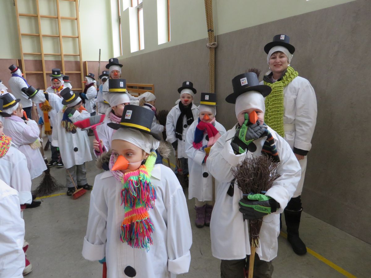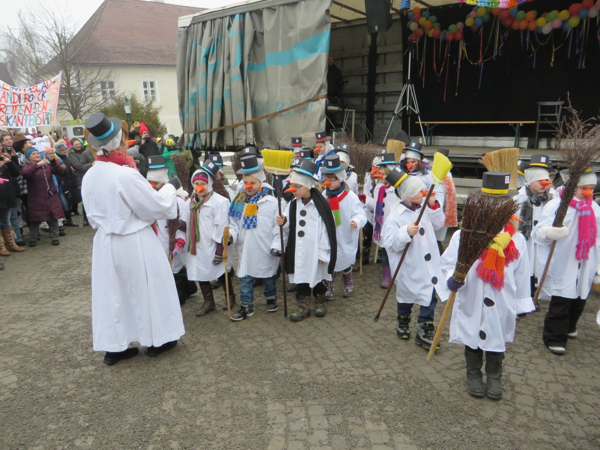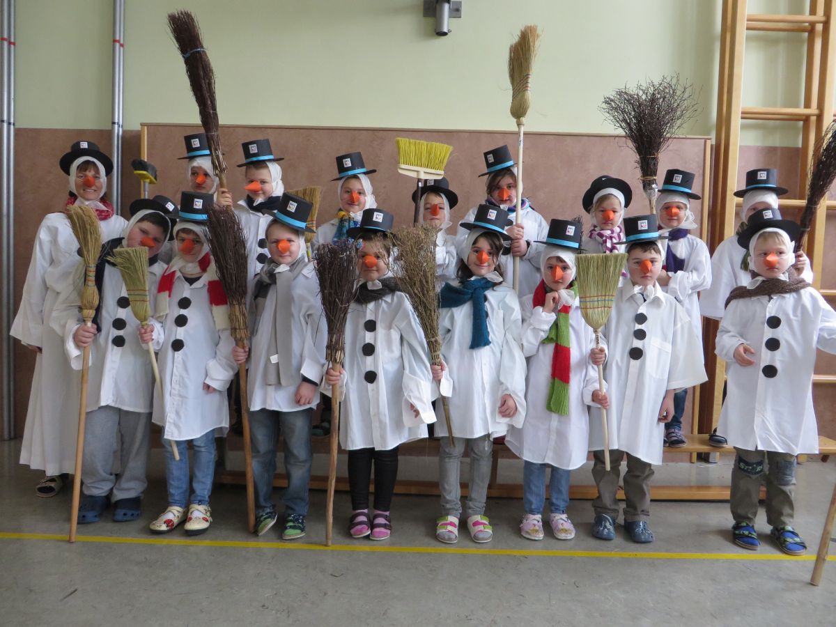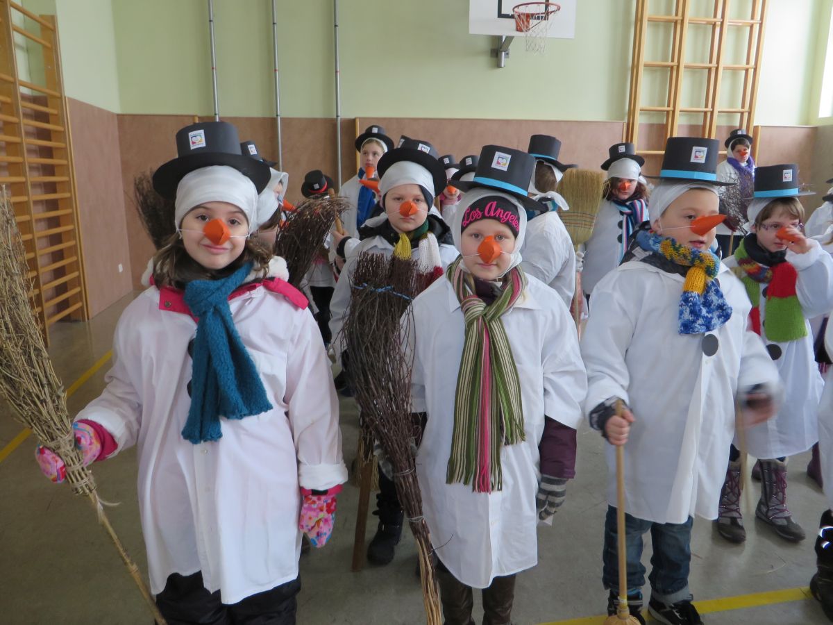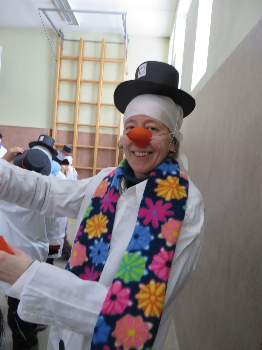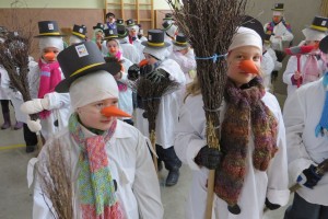 Dafür stellte jedes Volksschulkind im Werkunterricht eine Schneemannverkleidung her. Im Musikunterricht wurde ein Tanz zu „Frosty the Snowman“ einstudiert, den am Faschingssonntag alle 60 „Schneemannkinder“ vorführten.